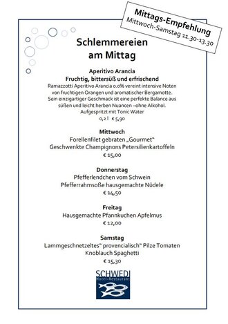 Abends “Fisch - was das Herz begehrt” oder “Menü für Nicht-Fischesser” in sieben kleinen Gängen. Immer Mittwoch bis Samstag.