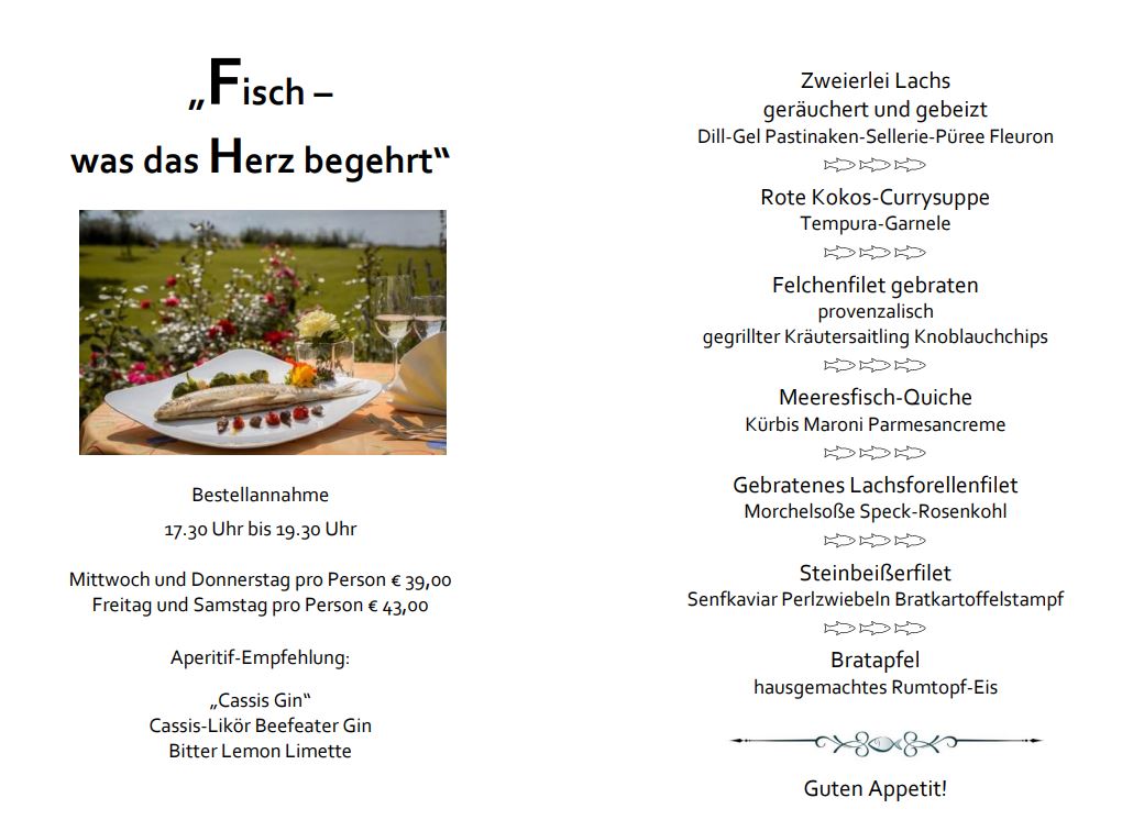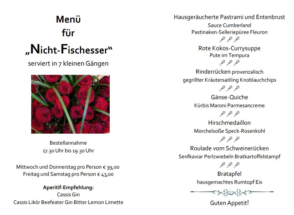 Wir bieten Ihnen auch gerne auf Vorbestellung wieder unser Menü “für Nicht-Fischesser” an.